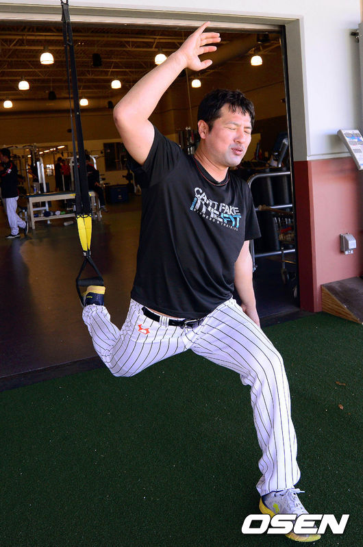 전지훈련지 애리조나에서 선수들은 타격,투구 등 개인 기량만이 아니라 웨이트 트레이닝을 통해 한 시즌을 지탱할 근육 만들기에 힘쓰고 있다.롯데 이정민이 하체 근력을 키우는 웨이트 트레이닝을 하고 있다.