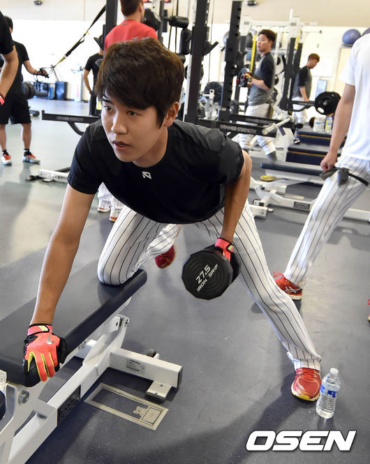 전지훈련지 애리조나에서 선수들은 타격,투구 등 개인 기량만이 아니라 웨이트 트레이닝을 통해 한 시즌을 지탱할 근육 만들기에 힘쓰고 있다.롯데 홍성민이 웨이트 트레이닝을 하고 있다.