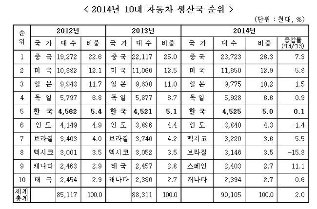 한국자동차산업협회는 지난해 세계 자동차생산 자료(해외생산은 현지국가에 포함)를 분석한 결과, 우리나라의 자동차생산은 452만 대로 10년 연속 세계 자동차생산국 5위, 세계 자동차생산비중의 5.0%를 차지했다고 밝혔다. 이는 엔저로 인한 수출 감소에도 불구하고, 신차출시 등으로 인한 내수확대로 생산이 소폭 증가했기 때문으로 풀이된다.