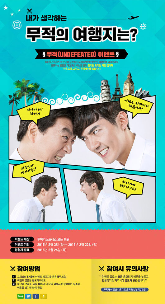 SM C&C 투어익스프레스 측은 “자신이 생각하는 무적의 여행지를 추천하는 이벤트이기 때문에 참여자들의 불꽃 튀는 여행지 추천 경쟁이 예상 된다” 며 기대감을 나타냈다.