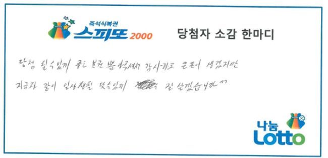 스피또2000 16회차 20억 1등 당첨복권 및 당첨자 소감 이미지.