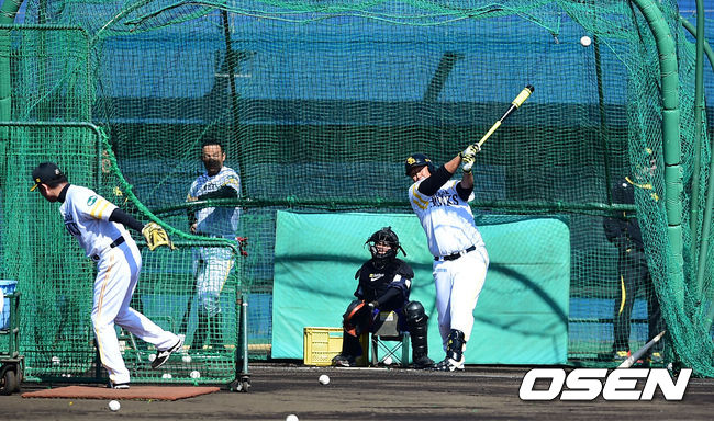 3일 오후 일본 미야자키(宮崎) 이키메노모리 운동공원 내 아이비스타디움에서 진행된 일본 프로야구 소프트뱅크 스프링캠프, 이대호가 프리배팅을 하고 있다.