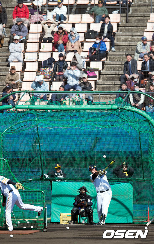 3일 오후 일본 미야자키(宮崎) 이키메노모리 운동공원 내 아이비스타디움에서 진행된 일본 프로야구 소프트뱅크 스프링캠프, 이대호가 프리배팅을 하고 있다.