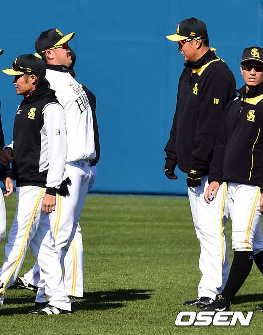 3일 오후 일본 미야자키(宮崎) 이키메노모리 운동공원 내 아이비스타디움에서 진행된 일본 프로야구 소프트뱅크 스프링캠프,이대호와 우치가와가 장난을 치고 있다.