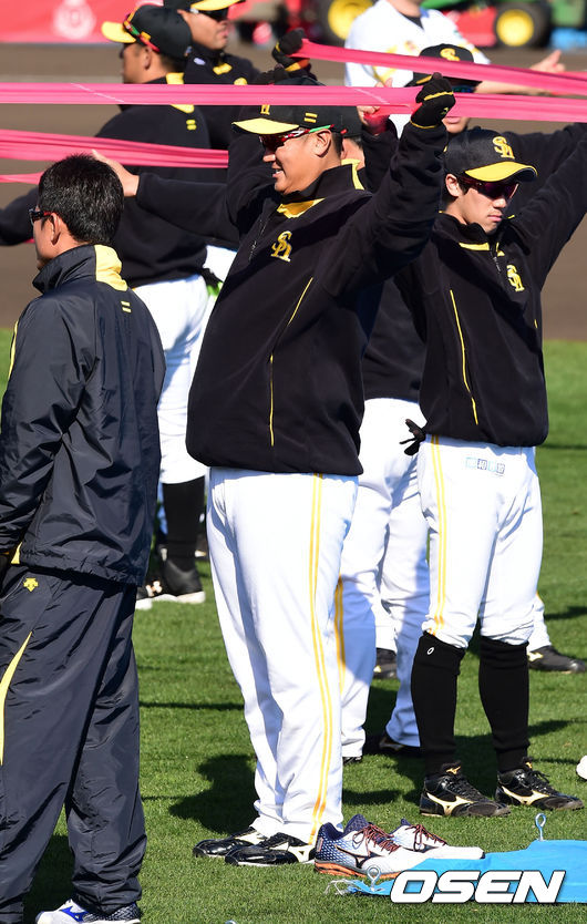 3일 오후 일본 미야자키(宮崎) 이키메노모리 운동공원 내 아이비스타디움에서 진행된 일본 프로야구 소프트뱅크 스프링캠프,이대호가 밴드운동을 하고 있.