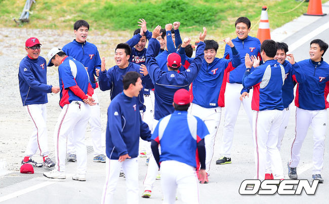 KIA 투수들이 김기태 감독과 가위바위보로 달리기 훈련을 진행하며 환하게 미소짓고 있다.