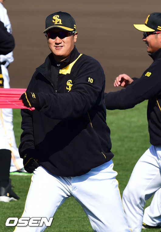 3일 오후 일본 미야자키(宮崎) 이키메노모리 운동공원 내 아이비스타디움에서 진행된 일본 프로야구 소프트뱅크 스프링캠프,이대호가 밴드운동을 하고 있다.