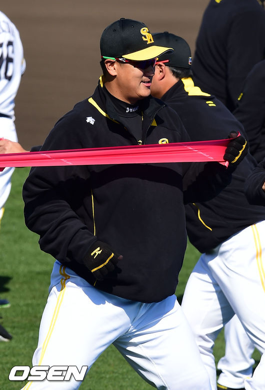 3일 오후 일본 미야자키(宮崎) 이키메노모리 운동공원 내 아이비스타디움에서 진행된 일본 프로야구 소프트뱅크 스프링캠프,이대호가 밴드운동을 하고 있다.