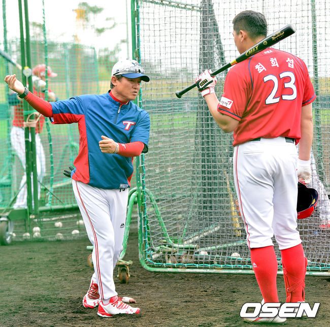 KIA 박흥식 코치가 최희섭과 대화를 나누고 있다.
