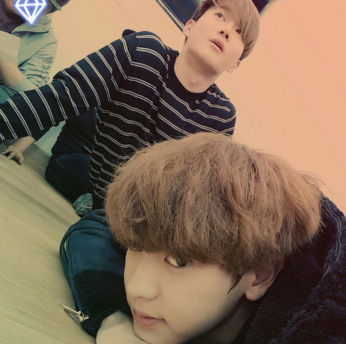 공개된 사진 속에는 엎두려 누운 채 눈을 동그랗게 뜬 찬열과 카메라를 눈치채지 못한 채 어딘가를 응시하고 있는 수호의 모습이 담겨있다. 특히 찬열은 복슬복슬한 헤어스타일로 대형견 같은 매력을 과시해 보는 이들의 시선을 사로잡고 있다.