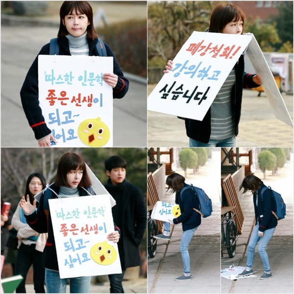 이와 관련 이하나가 대학생들 사이에서 ‘나 홀로 1인 시위’를 하고 있는 첫 촬영 현장이 포착돼 시선을 사로잡고 있다. 굳게 입을 다문 채 비장한 각오를 드러낸 이하나가 “따스한 인문학 좋은 선생이 되고 싶어요”, “폐강 철회! 강의하고 싶습니다” 등의 문구가 적힌 피켓을 앞뒤로 들쳐 메고 있는 모습이 관심을 모으고 있는 것. 하지만 당당하게 시위에 나선 것도 잠시, 이내 피켓사이로 얼굴을 가리고 주변을 살피는가하면, 구석진 곳에서 시위하던 피켓을 손과 발을 총동원해 부수는 모습으로 궁금증을 자아내고 있다.
