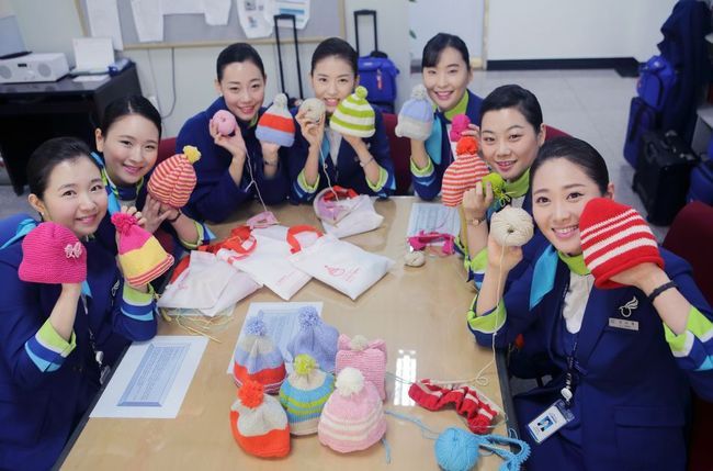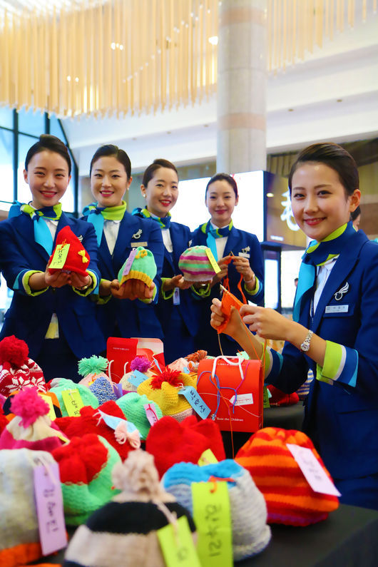 150여명의 승무원이 직접 뜬 200여개의 행복나눔 모자 전시