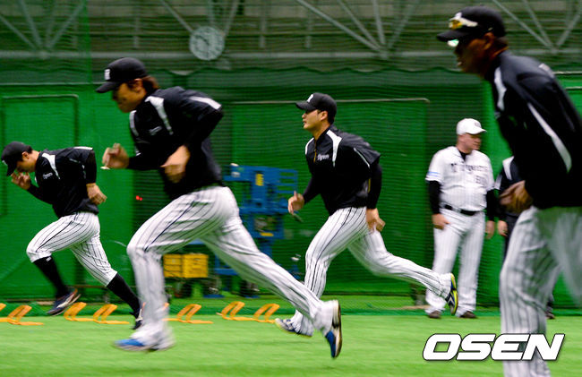 오승환을 비롯한 한신 선수들이 실내 달리기 훈련을 하고 있다.