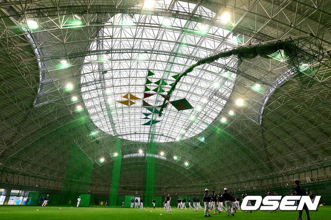 오승환을 비롯한 한신 선수들이 실내에서 몸을 풀고 있다.