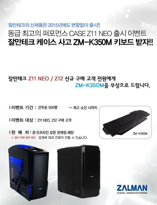 세계적인 PC 하드웨어 전문 기업 잘만테크㈜(www.zalman.co.kr)는 신제품 케이스 'Z11 NEO' 출시에 맞춰 키보드 증정 행사를 진행한다.