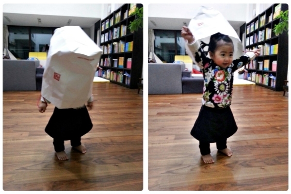 사진 속 라율이는 쇼핑백을 뒤집어 쓰고 있다. 크지 않은 쇼핑백임에도 몸의 절반을 가리고 있다. 또 다른 사진에서 라율이는 양팔을 올려 얼굴을 드러내고 있다. 깜찍한 장난이 웃음을 자아낸다.