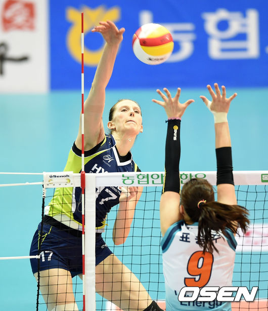 1세트 현대건설 폴리가 GS칼텍스 블로킹 벽을 피해 공격을 시도하고 있다.