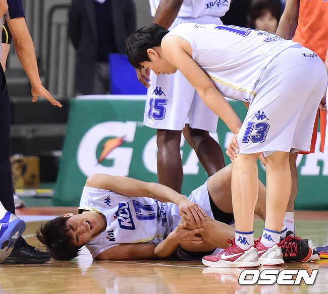 4일 오후 인천 삼산실내체육관에서 열린 '2014-2015 KCC 프로농구' 인천 전자랜드와 전주 KCC의 경기 2쿼터 KCC 신명호가 전자랜드 이현호와 충돌 후 고통스러운 표정을 짓고 있다.