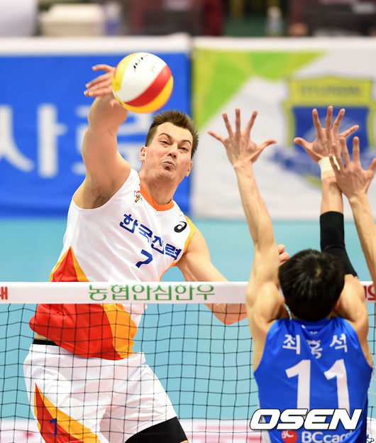2세트 한국전력 쥬리치가 우리카드의 블로킹 벽을 피해 공격을 시도하고 있다.
