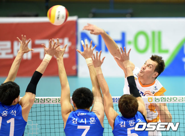 2세트 한국전력 쥬리치가 우리카드의 블로킹 벽을 피해 공격을 시도하고 있다.