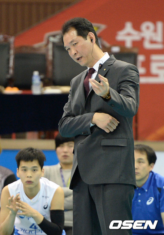 2세트 우리카드 양진웅 감독대행이 작전을 지시하고 있다.