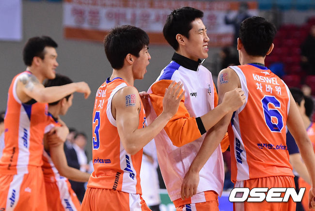 4일 오후 인천 삼산실내체육관에서 열린 '2014-2015 KCC 프로농구' 인천 전자랜드와 전주 KCC의 경기 종료 후 전자랜드 선수들이 승리를 기뻐하고 있다.