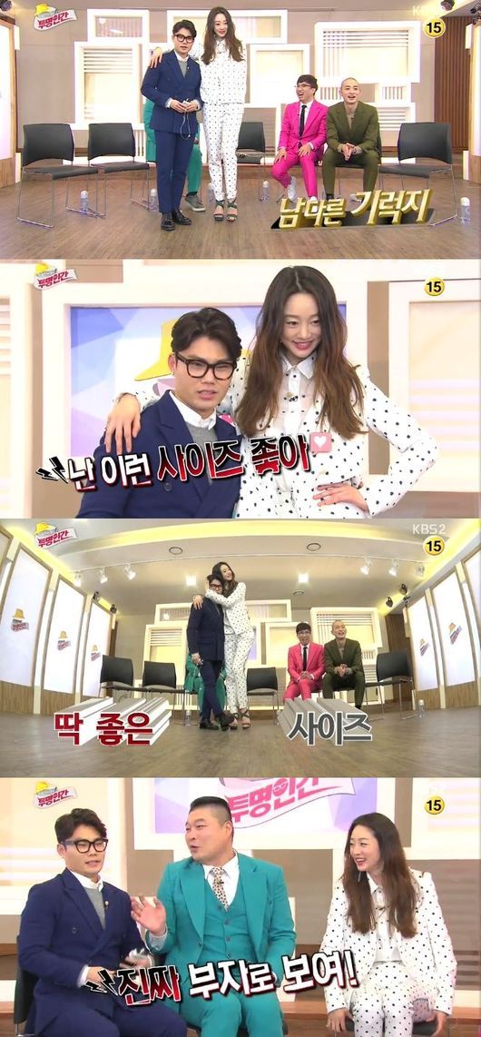 이에 강호동은 "한 번 서 보라"고 두 사람이 함께 서 볼 것을 제안했고, 망설이던 김범수는 최여진의 옆에 섰다.