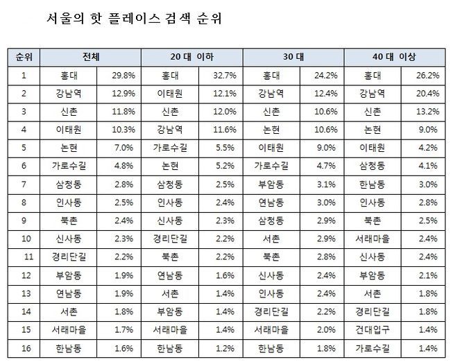 한편 가장 많은 검색 횟수를 기록한 최고의 핫 플레이스는 ‘홍대’로 나타났다. 모든 연령대에서 핫 플레이스 검색순위 1위에 오른 홍대(29.8%)에 이어 강남역(12.9%), 신촌(11.8%), 이태원(10.3%), 논현동(7.0%)이 2~5위를 차지했다.
