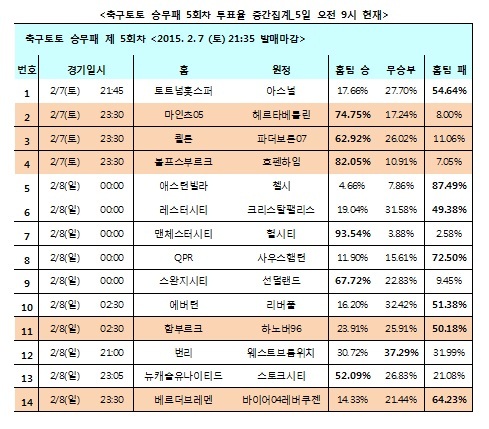 국민체육진흥공단(www.kspo.or.kr)이 발행하는 체육진흥투표권 공식 인터넷 발매사이트 베트맨(www.betman.co.kr)은 오는 2월 7일(토)부터 2월 8일(일)까지 벌어지는 잉글랜드 프리미어리그(EPL) 9경기 및 독일 분데스리가 5경기 등 총 14경기를 대상으로 한 축구토토 승무패 5회차 투표율 중간집계 결과, 프리미어리그 애스턴빌라-첼시(5경기)전에서 국내 축구팬 87.49%가 리그 선두 첼시의 승리를 점쳤다고 밝혔다.