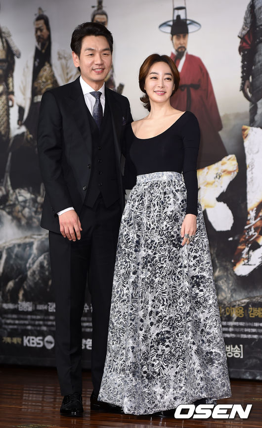 배우 김태우와 김혜은이 포토타임을 갖고 있다.