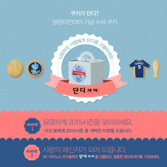 NC 다이노스가 발렌타인 데이에 맞춰 선물용 상품을 5일 내놓았다. 다이노스의 마스코트 '단디'와 야구방망이, 야구공의 이미지를 활용한 수제 쿠키다. 이름은 '단디ㅋㅋ'. 'ㅋㅋ'는 쿠키의 자음을 딴 것으로, 재간둥이 단디의 익살스러움을 표현했다.