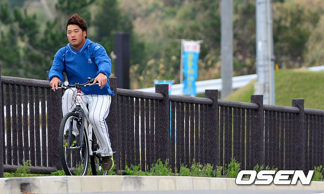 삼성 박석민이 숙소에서 훈련장까지 자전거로 이동하고 있다.