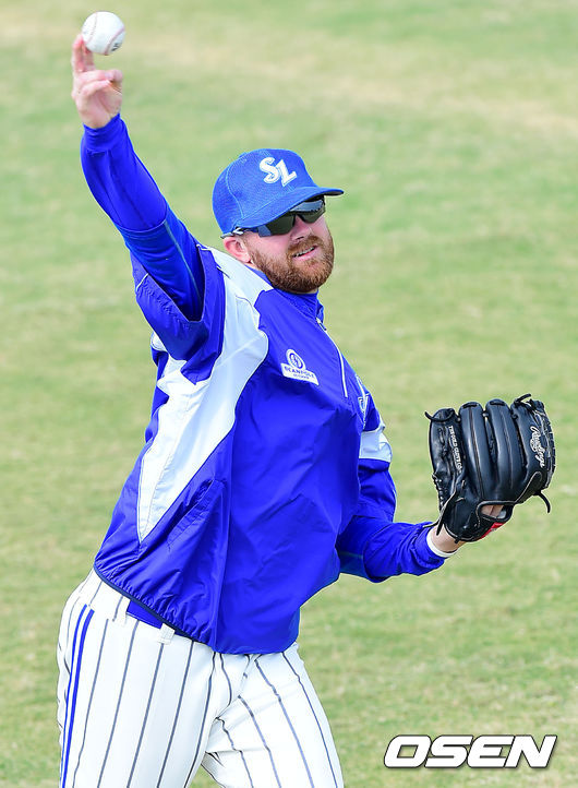 삼성 새 외국인투수 타일러 클로이드가 롱토스 훈련을 하고 있다.