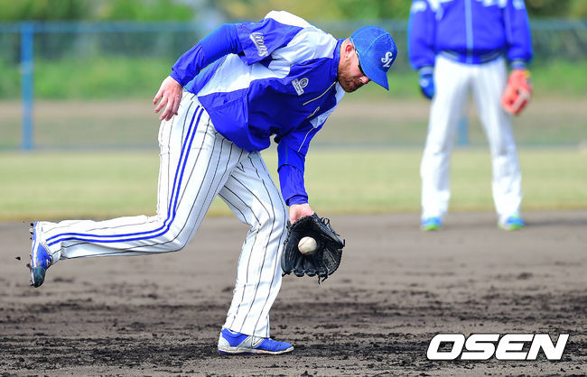 삼성 새 외국인투수 타일러 클로이드가 수비 훈련을 하고 있다.
