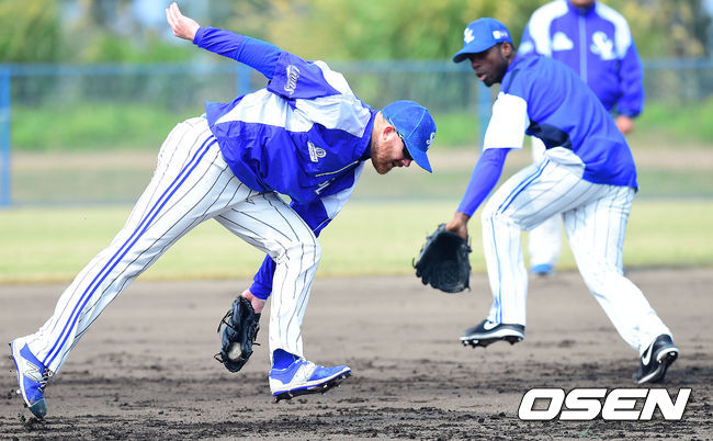 삼성 새 외국인투수 타일러 클로이드와 알프레도 피가로가 수비 연습을 하고 있다.