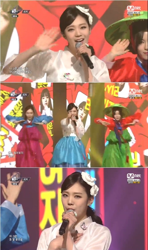 이날 리지는 고운 개량 한복을 입고 무대에 올랐다. 신난 트로트 리듬에 맞춰 애교 가득한 목소리, 안무로 눈과 귀를 함께 사로잡았다.
