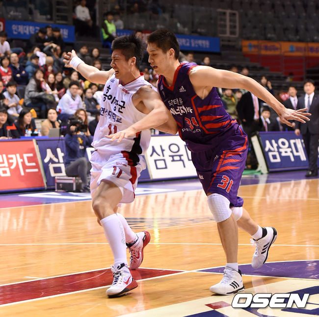 1쿼터 KGC 양희종과 오리온스 장재석이 몸싸움을 펼치고 있다.