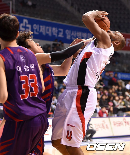 2쿼터 KGC 윌리암스가 오리온스 허일영에게 반칙을 당하고 있다.