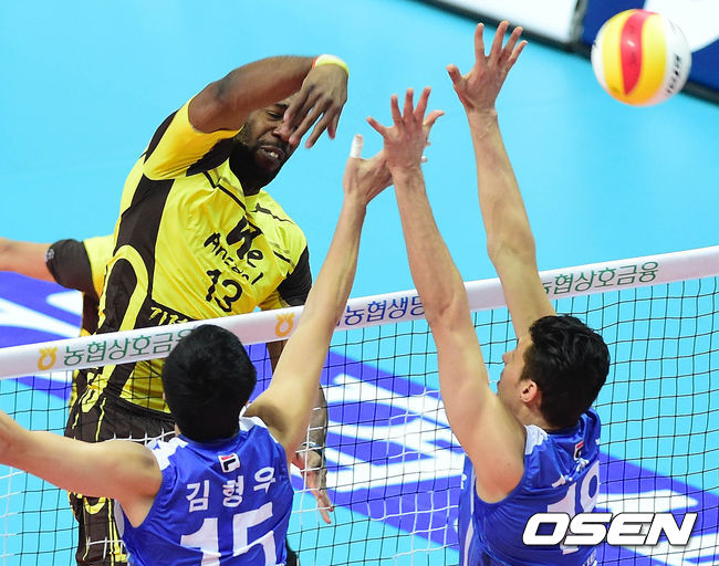 5일 오후 안산 상록수체육관에서 열린 '2014-2015 NH농협 V-리그' OK저축은행과 대한항공의 경기 1세트 시몬이 공격을 시도하고 있다.