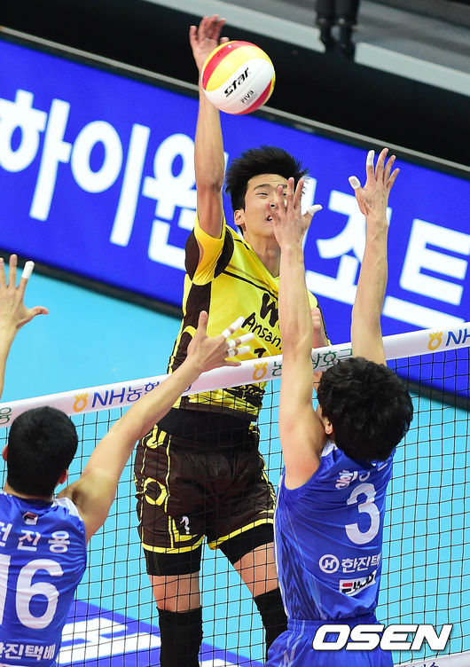 5일 오후 안산 상록수체육관에서 열린 '2014-2015 NH농협 V-리그' OK저축은행과 대한항공의 경기 1세트 송명근이 공격을 시도하고 있다.