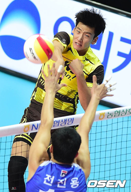 5일 오후 안산 상록수체육관에서 열린 '2014-2015 NH농협 V-리그' OK저축은행과 대한항공의 경기 1세트 송명근이 공격을 시도하고 있다.