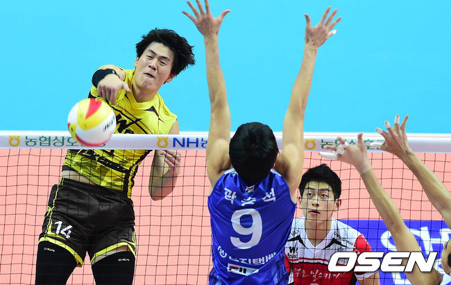 5일 오후 안산 상록수체육관에서 열린 '2014-2015 NH농협 V-리그' OK저축은행과 대한항공의 경기 1세트 송희채가 공격을 시도하고 있다.