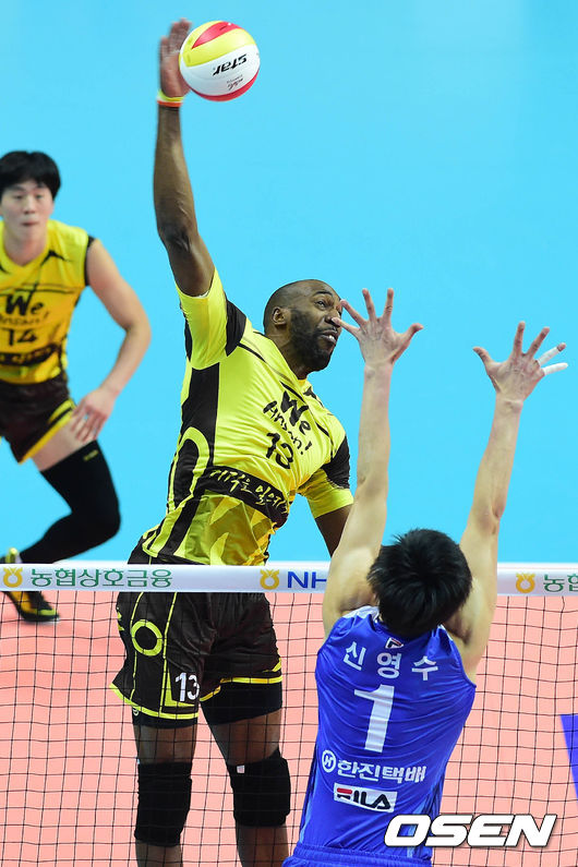 5일 오후 안산 상록수체육관에서 열린 '2014-2015 NH농협 V-리그' OK저축은행과 대한항공의 경기 1세트 시몬이 공격을 시도하고 있다.