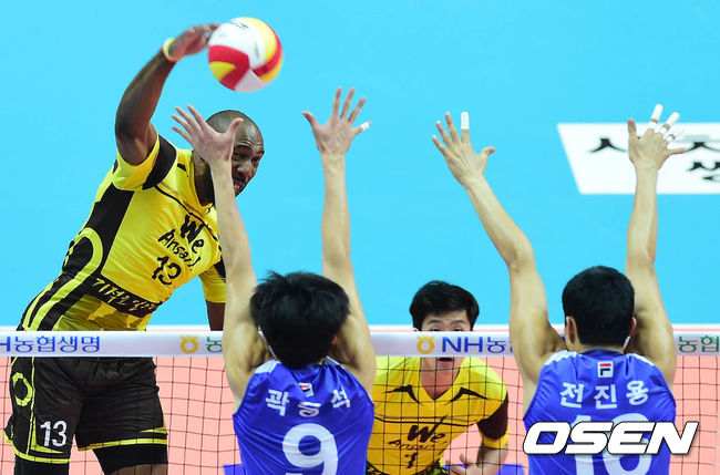 5일 오후 안산 상록수체육관에서 열린 '2014-2015 NH농협 V-리그' OK저축은행과 대한항공의 경기 1세트 시몬이 공격을 시도하고 있다.