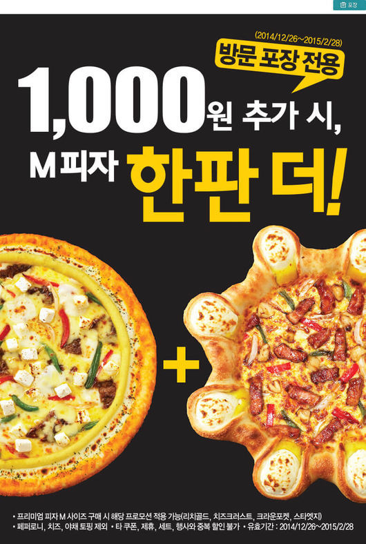 프리미엄 피자 천원의 행복 이벤트는 프리미엄 피자 미디엄 사이즈를 방문 포장으로 구매하는 고객에게 동일한 사이즈의 피자를 1000원에 한판 더 제공하는 행사다. 해당되는 제품은 리치골드, 치즈크러스트, 크라운포켓, 스타엣지 총 4종으로 추가하는 피자 역시 4종 중 선택 가능하다.