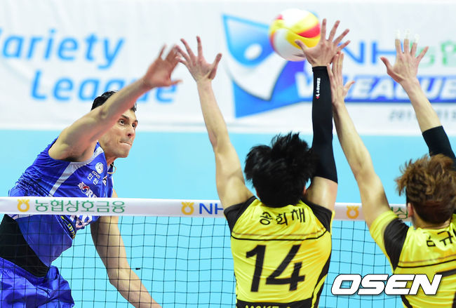 5일 오후 안산 상록수체육관에서 열린 '2014-2015 NH농협 V-리그' OK저축은행과 대한항공의 경기 2세트 산체스가 공격을 시도하고 있다.