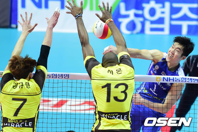 5일 오후 안산 상록수체육관에서 열린 '2014-2015 NH농협 V-리그' OK저축은행과 대한항공의 경기 2세트 신영수가 공격을 시도하고 있다.