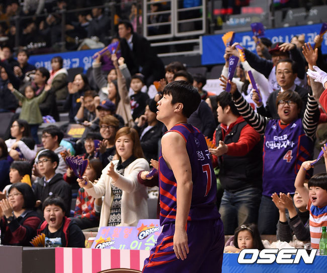 4쿼터 오리온스 전정규가 3점슛을 성공시키고 팬들의 환호를 받고 있다.