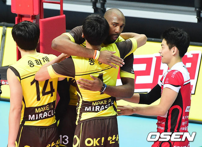 5일 오후 안산 상록수체육관에서 열린 '2014-2015 NH농협 V-리그' OK저축은행과 대한항공의 경기 종료 후 시몬이 송명근과 포옹을 하고 있다.