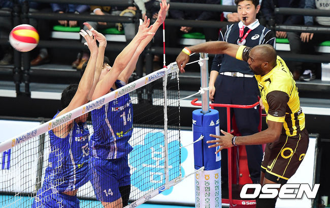 5일 오후 안산 상록수체육관에서 열린 '2014-2015 NH농협 V-리그' OK저축은행과 대한항공의 경기 4세트 시몬이 공격을 시도하고 있다.